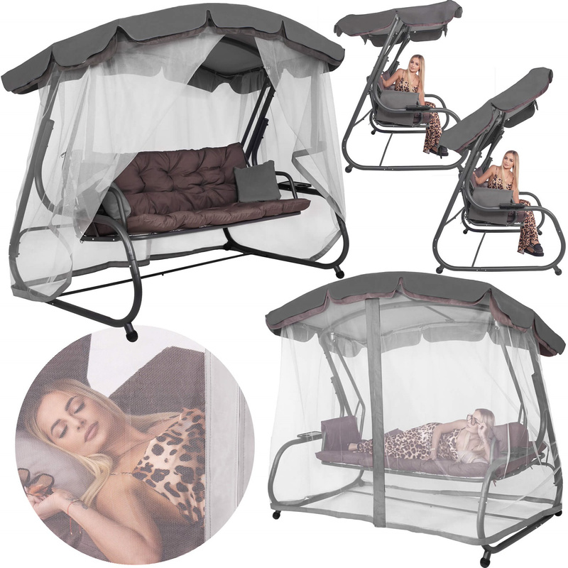 ( ilość produktów: 32 )Huśtawka ogrodowa z daszkiem i moskitierą, 3-osobowa z funkcją leżanki brązowo-szara