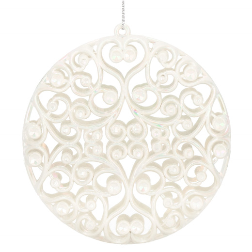 Okrągła, zdobiona zawieszka świetnie wygląda jako dodatek do większego prezentu lub dekoracja na bożonarodzeniową choinkę. Prezentowana ozdoba świąteczna o kremowym kolorze cudownie mieni się w ciągu dnia, jak i po zmroku dzięki perłowemu połyskowi. Nietłukący się materiał zwiększa bezpieczeństwo, co pozwala na wspólne tworzenie dekoracji świątecznych z najmłodszymi domownikami. W zestawie znajduje się gratisowy sznureczek, które umożliwia powieszenie zawieszki w wybranym przez siebie miejscu. Ta piękna bombka świąteczna sprawdzi się w charakterze ozdoby choinkowej, jak również może pełnić rolę dekoracji okiennej.