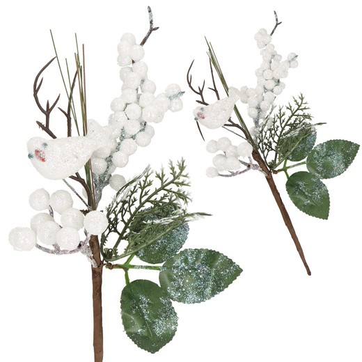• W skład gałązki wchodzą: białe kuleczki (jarzębina), sztuczne liście i gałązki, brokatowy ptaszek